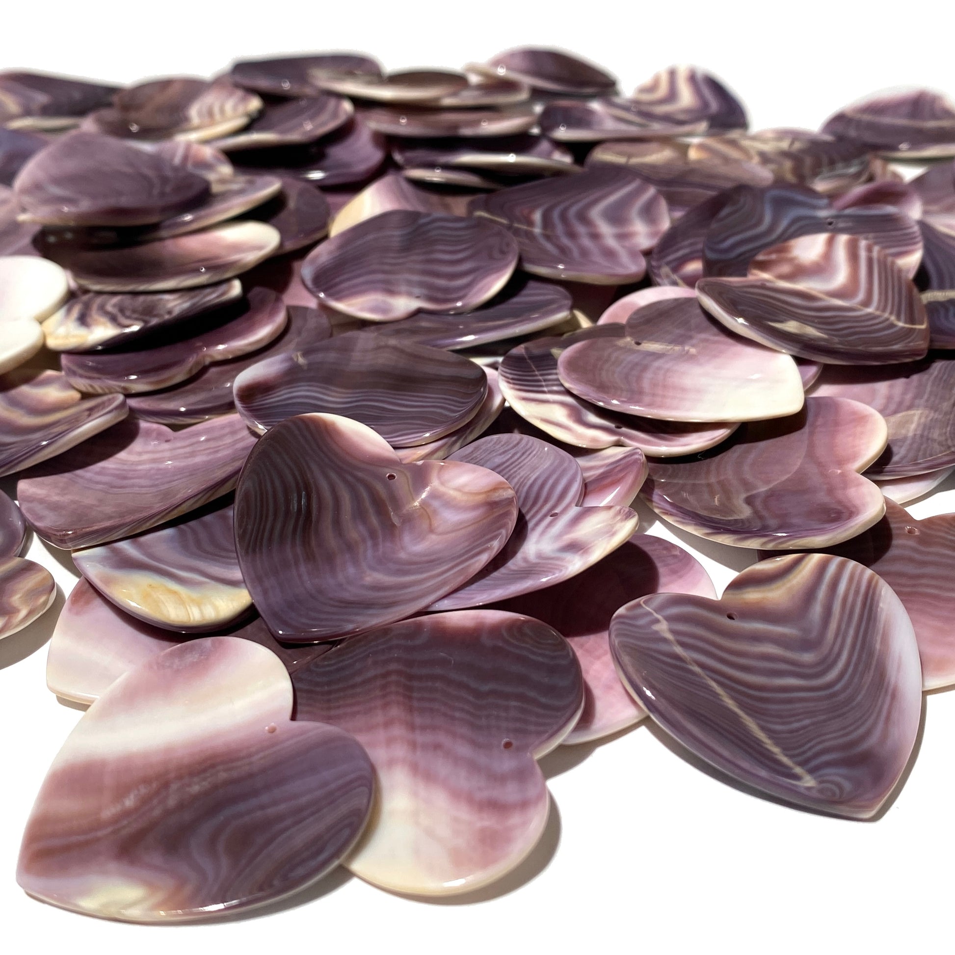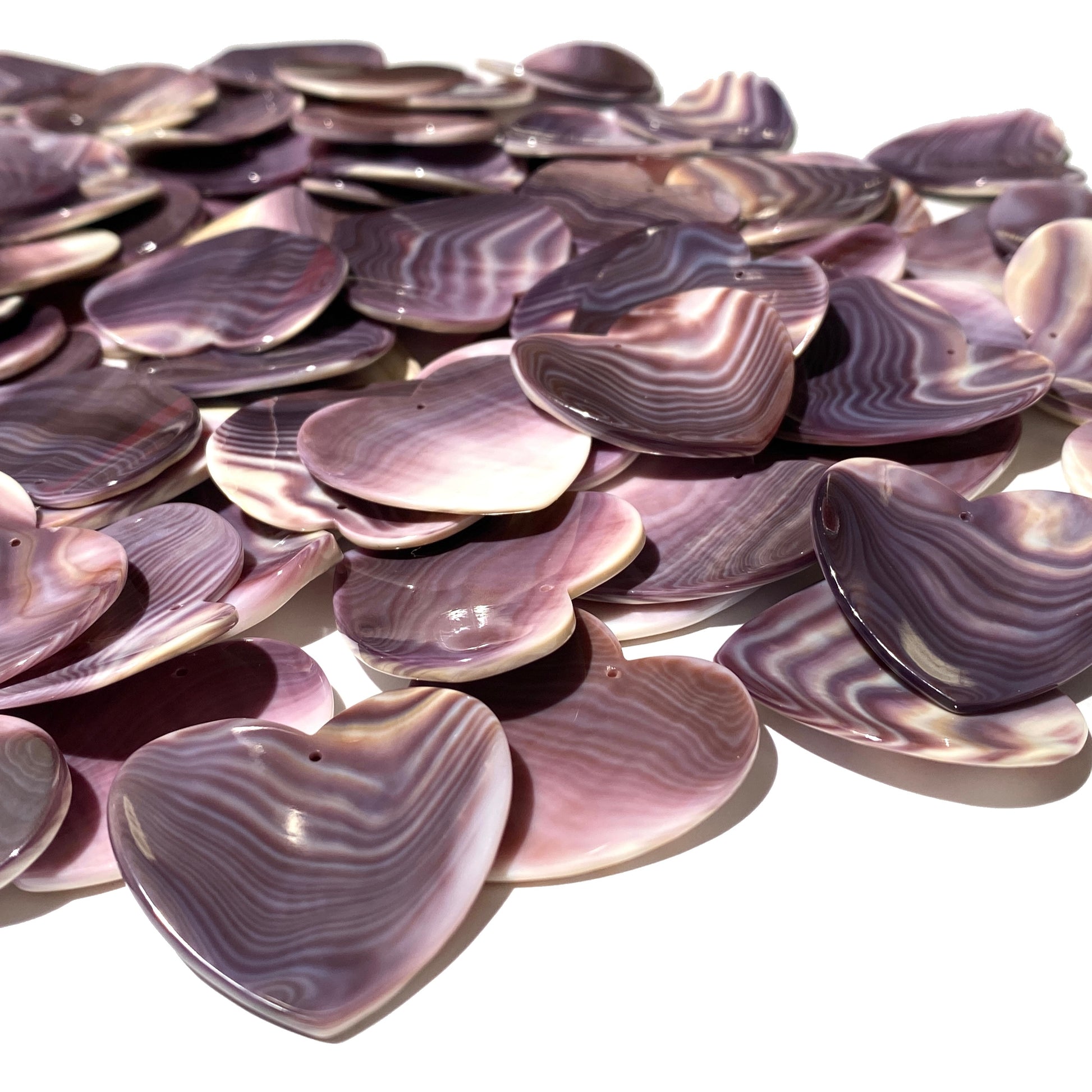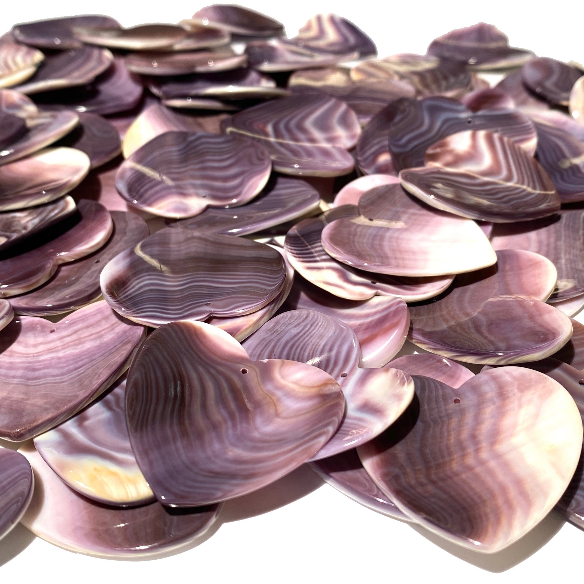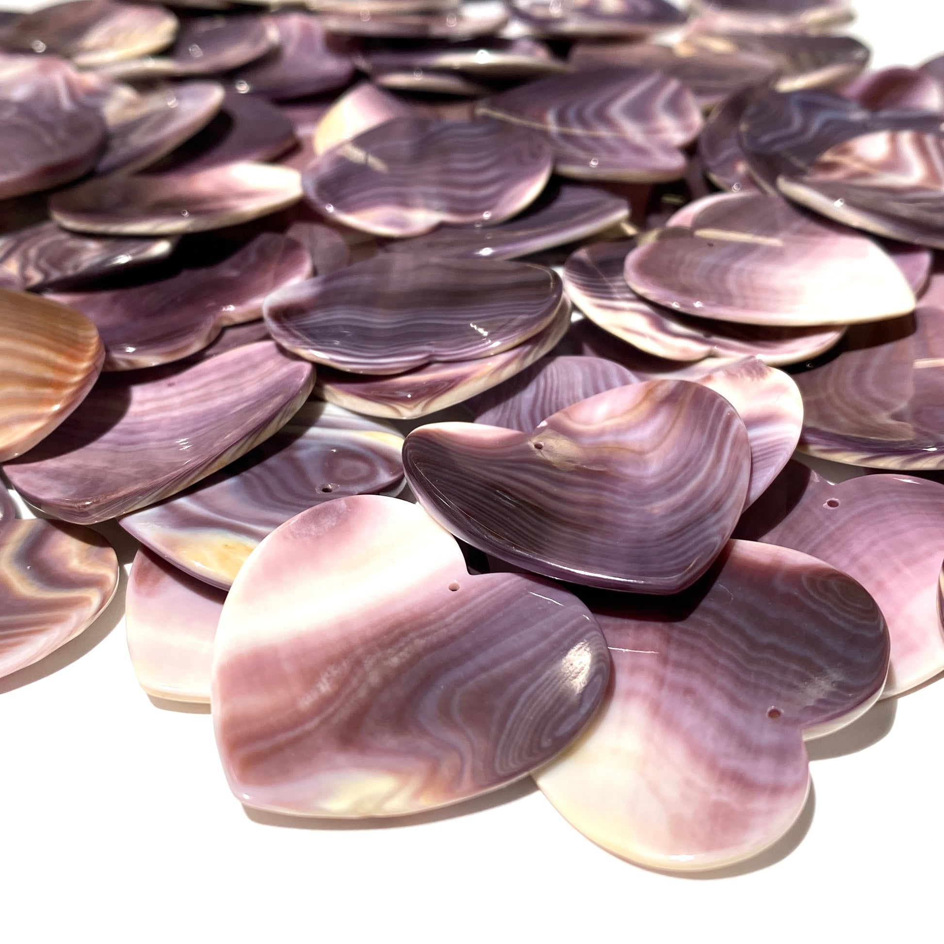 2-Tone-Matrix Lavender Wampum Shell Bead Pendant From New York/Rhode Island (America's First Currency Year 1637-1673) Top Drilled - Convex Heart Shape - 4 Matching Pendants Lot (4 Pcs)