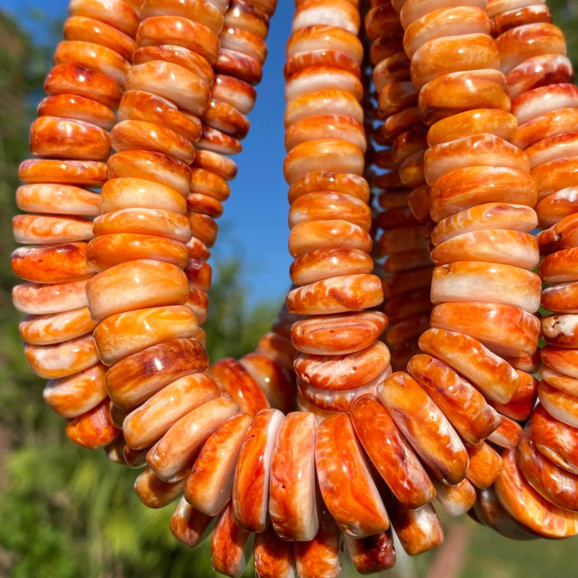 Introducing our latest addition to the ALOHA GEMS USA product line, the Gigantic Mexican Orange Spiny Oyster shell graduated beads. These beautiful beads come in a loose strand of 15.5 inches in length, with a 1mm hole size, and are 100% natural, not dyed, and not color-enhanced. Please note that this is not a finished piece of jewelry, and clasp is not included.