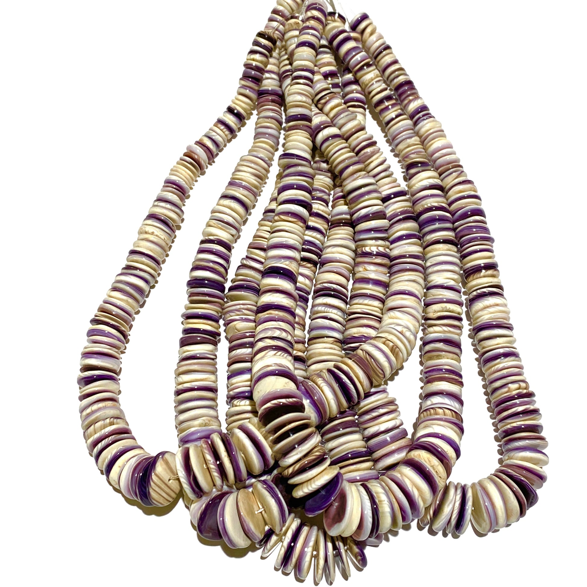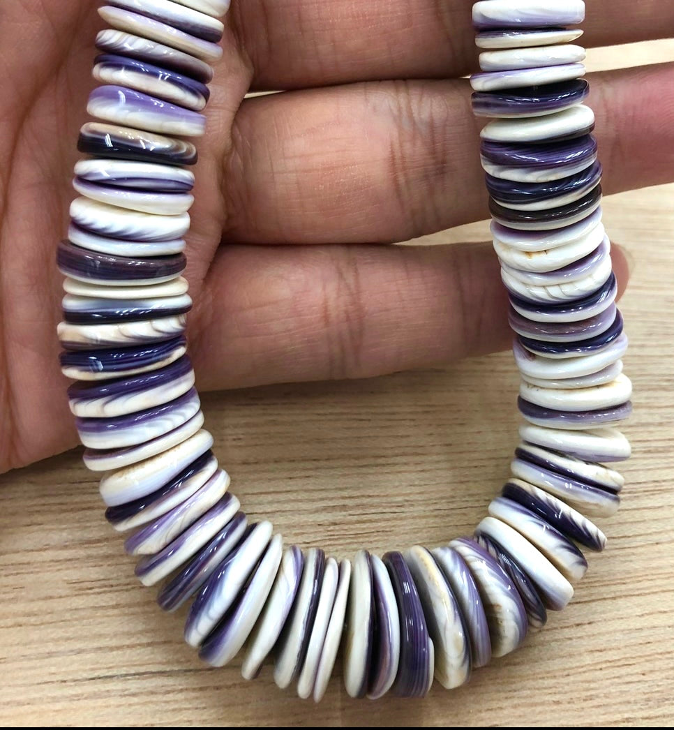 [WHAT'S IN THE PACKAGE] Orchid Wampum Quahog Shell From New England, USA- Grade AAA (100% Natural Color- Not Dyed Color/ Not Color Enhanced/ Not Heat Treated) You will get One strand 8-16mm graduated rondelle shape Wampum shell beads for jewelry making. The strand is 15.5 inches in length, and the hole has a diameter of 1mm. Please note that the clasp and beading wire are not included